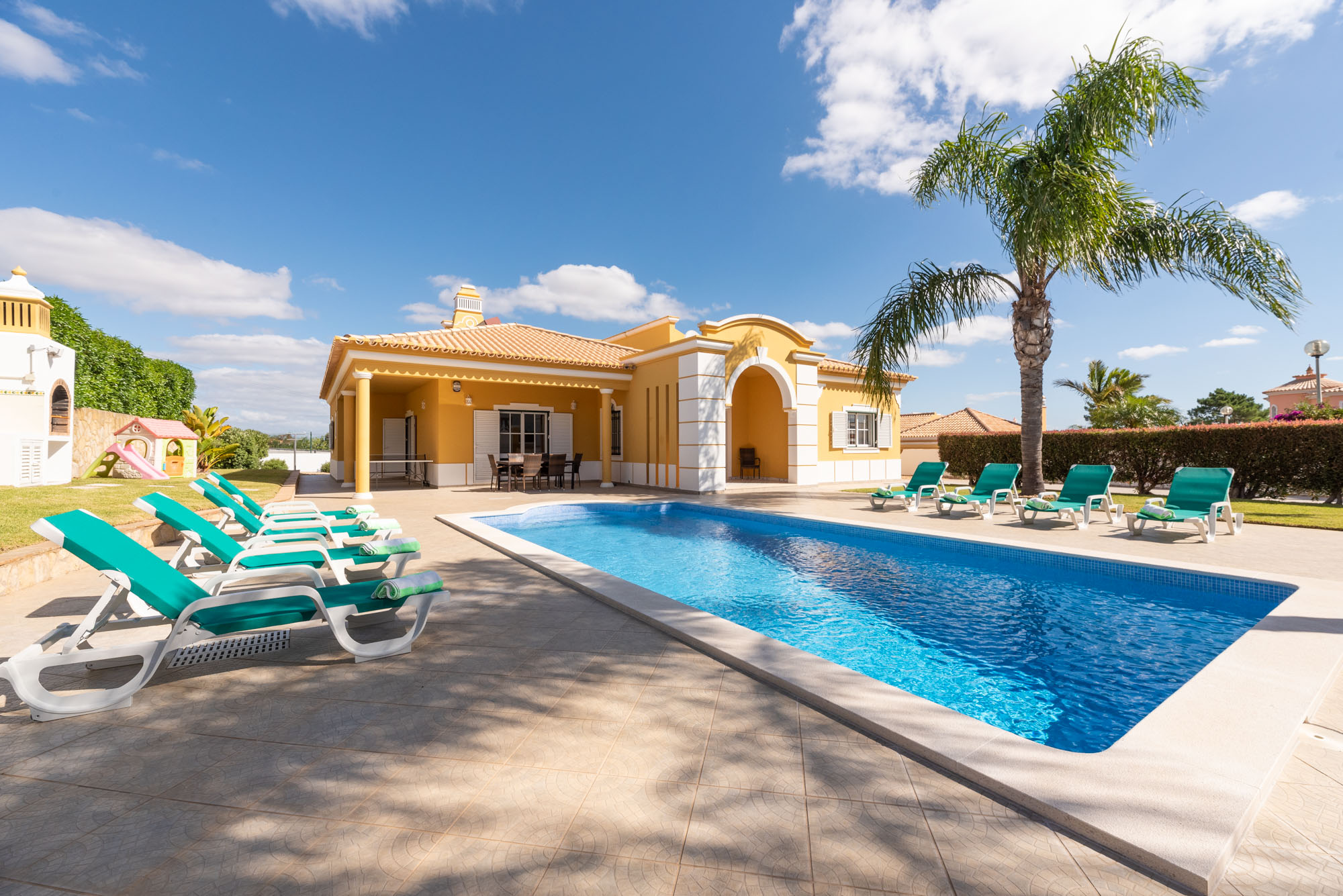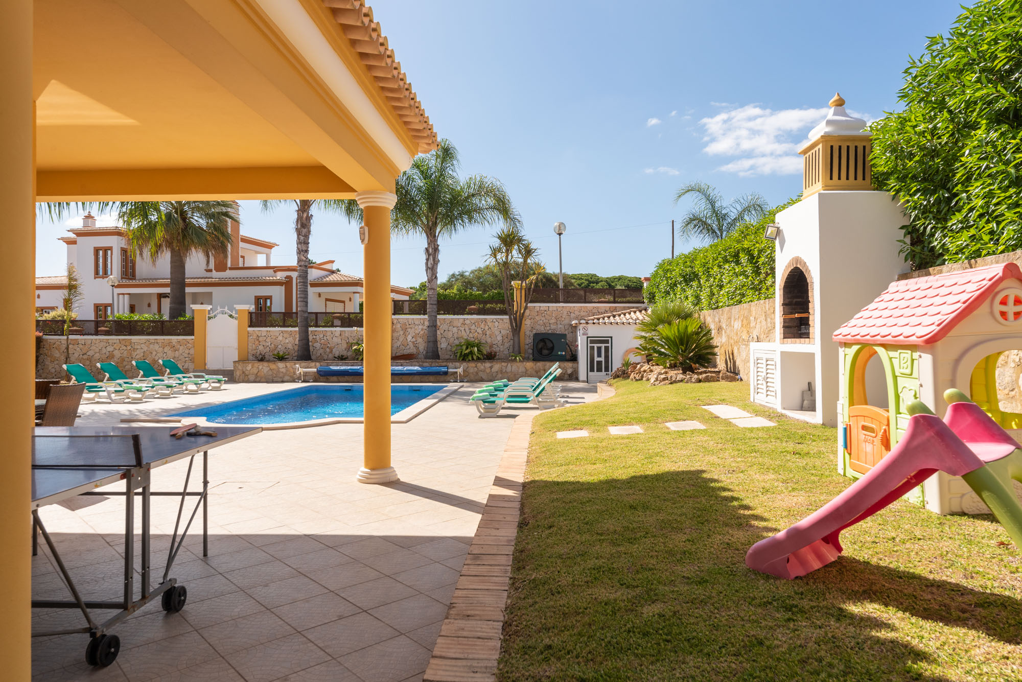 This exquisite 4-bedroom villa, with a private pool, is perfect for family or friend getaways and is located near the stunning Gale Beach, west of Albufeira. It’s close to Galé Beach, Salgados Golf Course, and Zoomarine family park. This single-level villa features four bedrooms, each with a private bathroom, a guest toilet, a well-appointed kitchen, and a harmonious living and dining area. The outdoor terrace connects to the pool area, complemented by a barbecue spot for al fresco dining. Additional amenities include a high chair, baby travel cot, ping-pong table, eight pool towels, and pool heating included in the price (arrange before check-in).