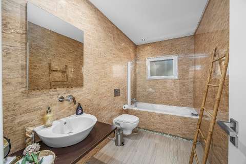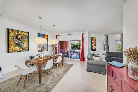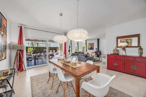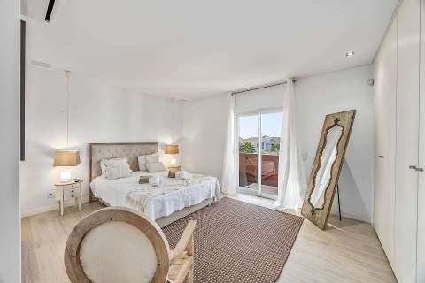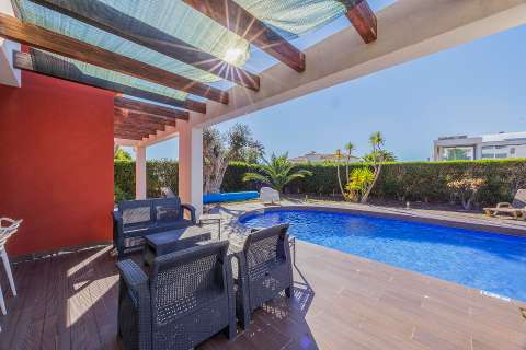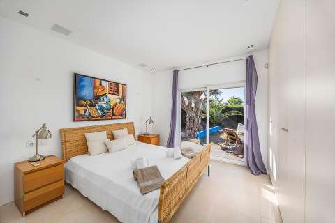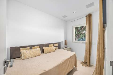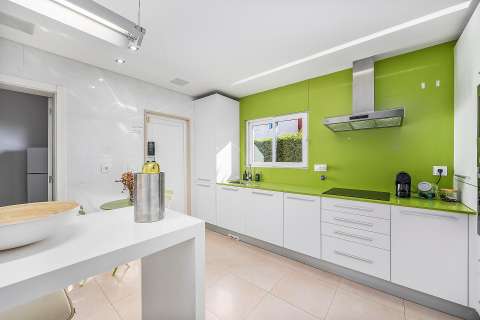 On the ground floor, you will find a spacious open-plan living and dining room with sliding doors that connect directly to the terrace and pool area. The kitchen is fully equipped with an oven, microwave, dishwasher, refrigerator, various utensils, coffee maker, toaster and kettle. On this floor there is also a laundry room with a washing machine and a large en-suite bedroom with air conditioning and direct access to the outside, as well as a small day room with a single bed for added flexibility.