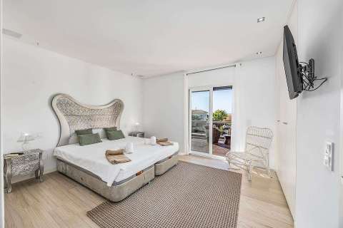 On the upper floor, the master suite includes a private bathroom, air conditioning and access to a sunny terrace with seating areas. The third suite, also with air conditioning, shares the same terrace.